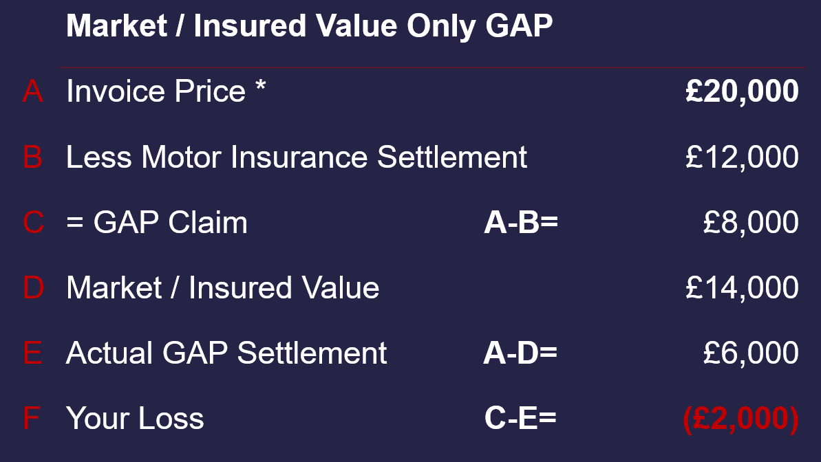 However, the many policies that contain “Market-Value” clauses reduce the amount paid to the customer by instead of paying the £8,000, they pay the lower difference between the higher “Market-Value” of the vehicle as determined by Glass's Guide Retail and the original purchase price. In this example, the “Market-Value” for this vehicle is £14,000 and it is this that these policies base their claim, paying the lower GAP settlement of £6,000 leaving the customer with a £2,000 shortfall.